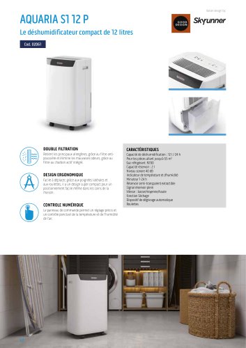 • A roulettes Design ergonomique Gaz réfrigérant R290 Signal réservoir plein Degré de protection IPXO Fonction évacuation en continu Réservoir semi-transparent extractible Indicateur de température et d'humidité